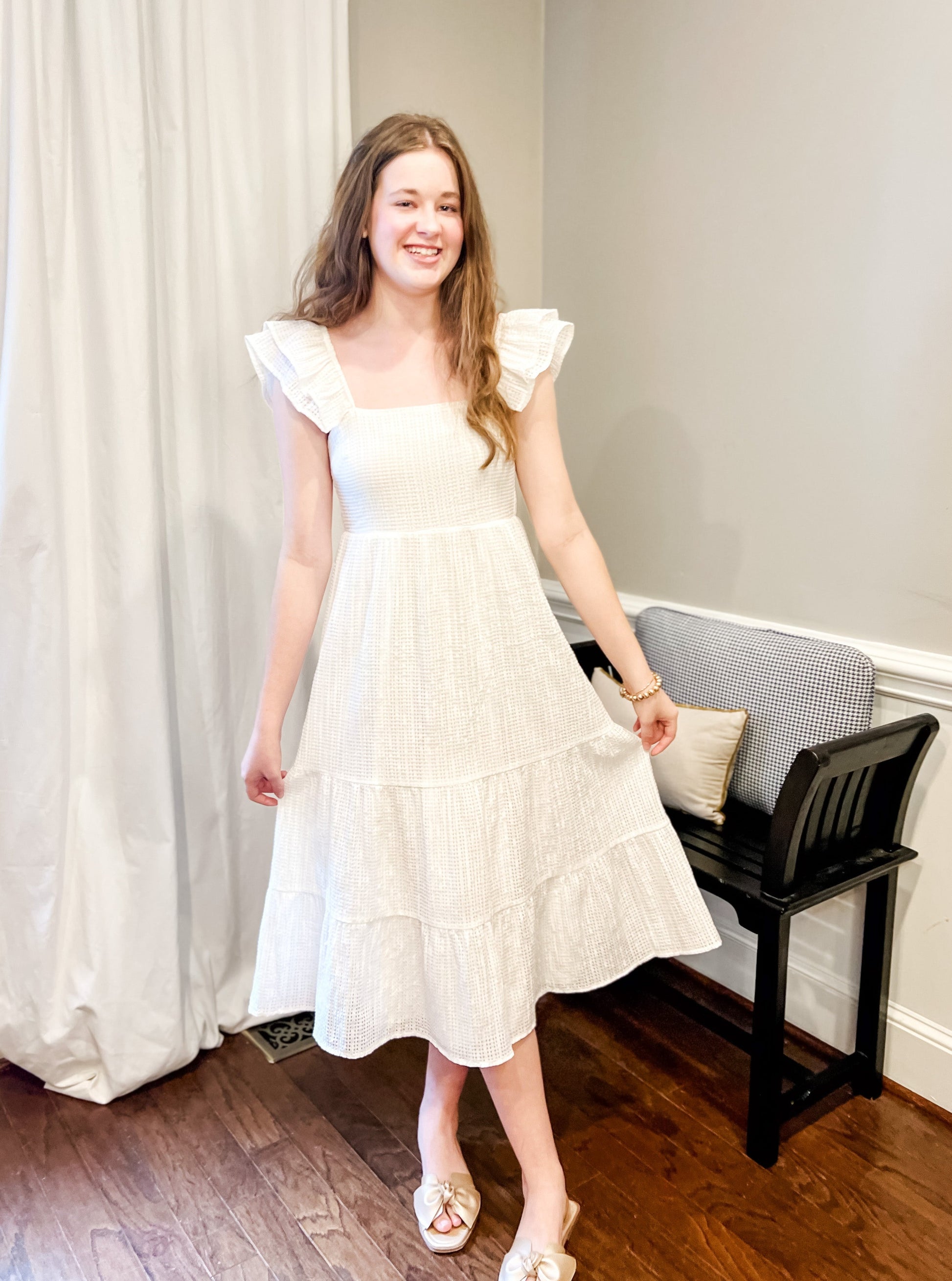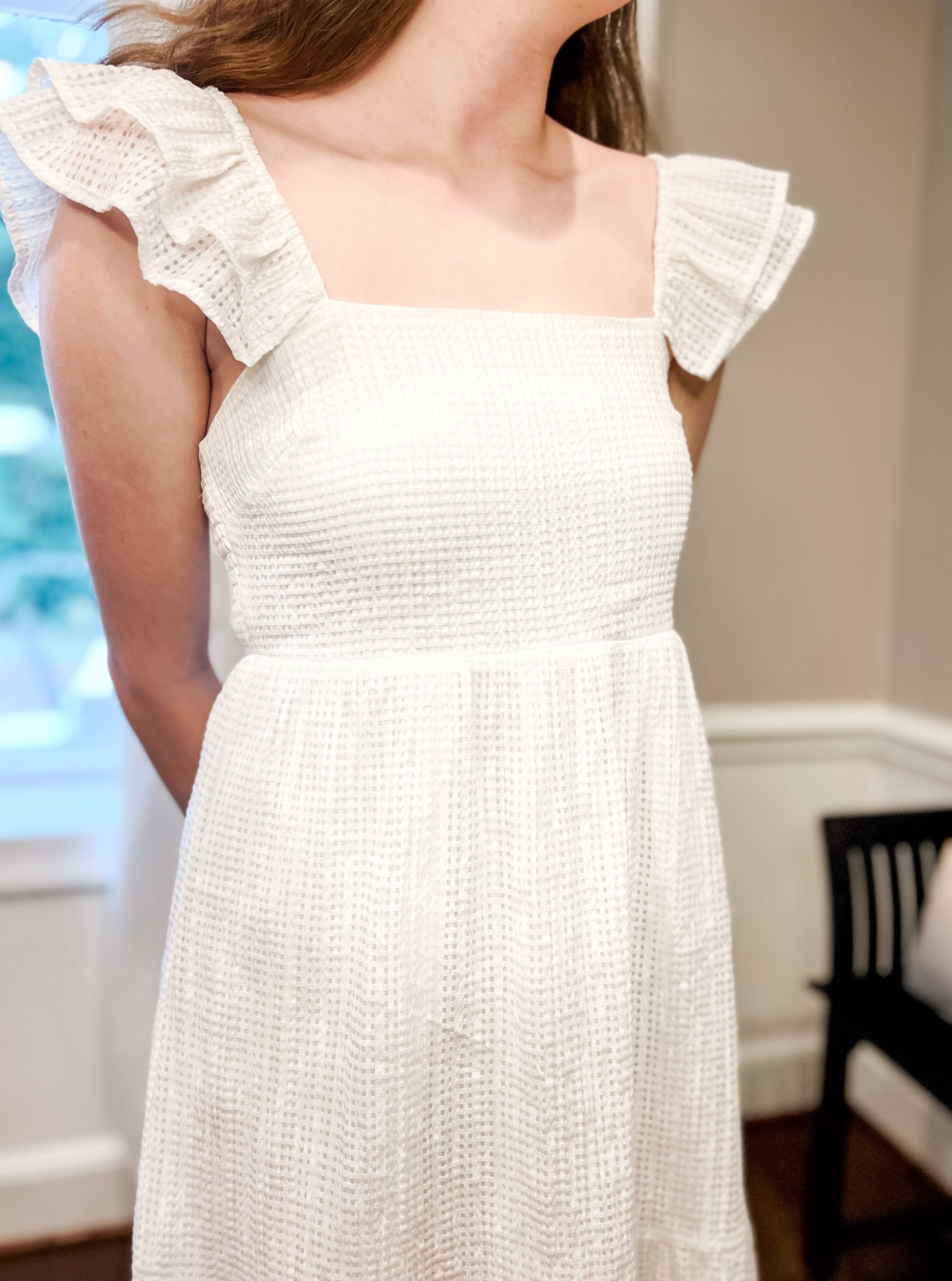 How cute is this midi dress with flutter sleeve?! We're in LOVE! Fully lined, the square neck and square pattern add a contemporary flare to this sweet, traditional dress.